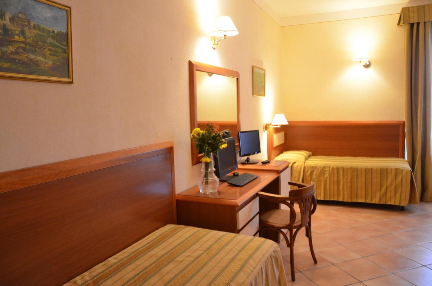 Piccola Camera MatrimonialeDoppia con Letti Singoli. Camera dotata di aria condizionata, frigorifero e TV a schermo piatto. Il bagno privato è completo di asciugacapelli. Al momento della prenotazione specificate la tipologia di letto desiderata. ;