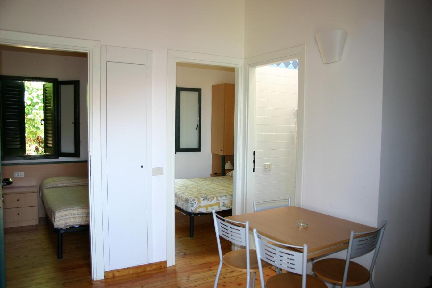 Bungalow con Vista Giardino. Queste unitĂ sono ampie, spaziose e luminose e offrono 2 camere da letto, un soggiorno con cucina accessoriata e divano-letto e una veranda esterna attrezzata. La tariffa include le lenzuola, le utenze e 1 posto auto. Gli asciugamani non vengono forniti. ;