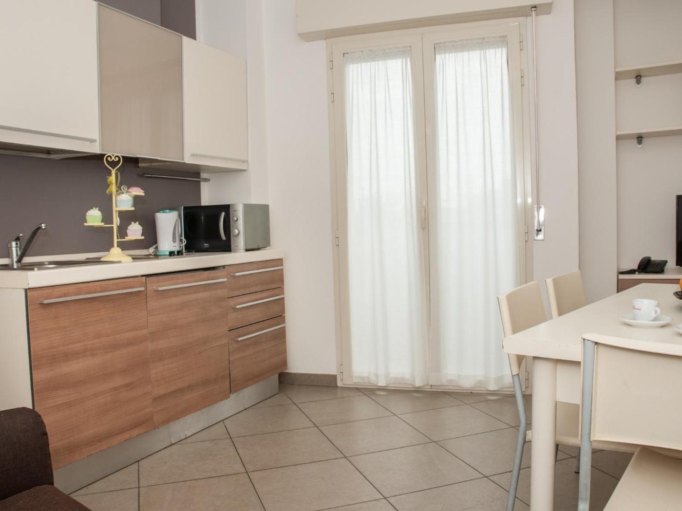 Gli alloggi dellArt Residence dispongono di zona pranzo e angolo cottura con microonde e frigorifero.