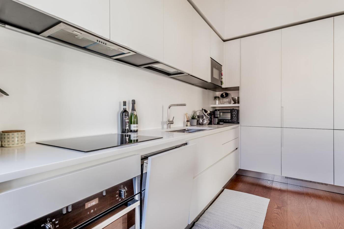 Questo appartamento con 2 camere da letto e aria condizionata presenta 2 bagni con bidet, doccia edi cortesia. La cucina ha frigorifero, lavastoviglie e forno, più macchina da caffè e bollitore elettrico.