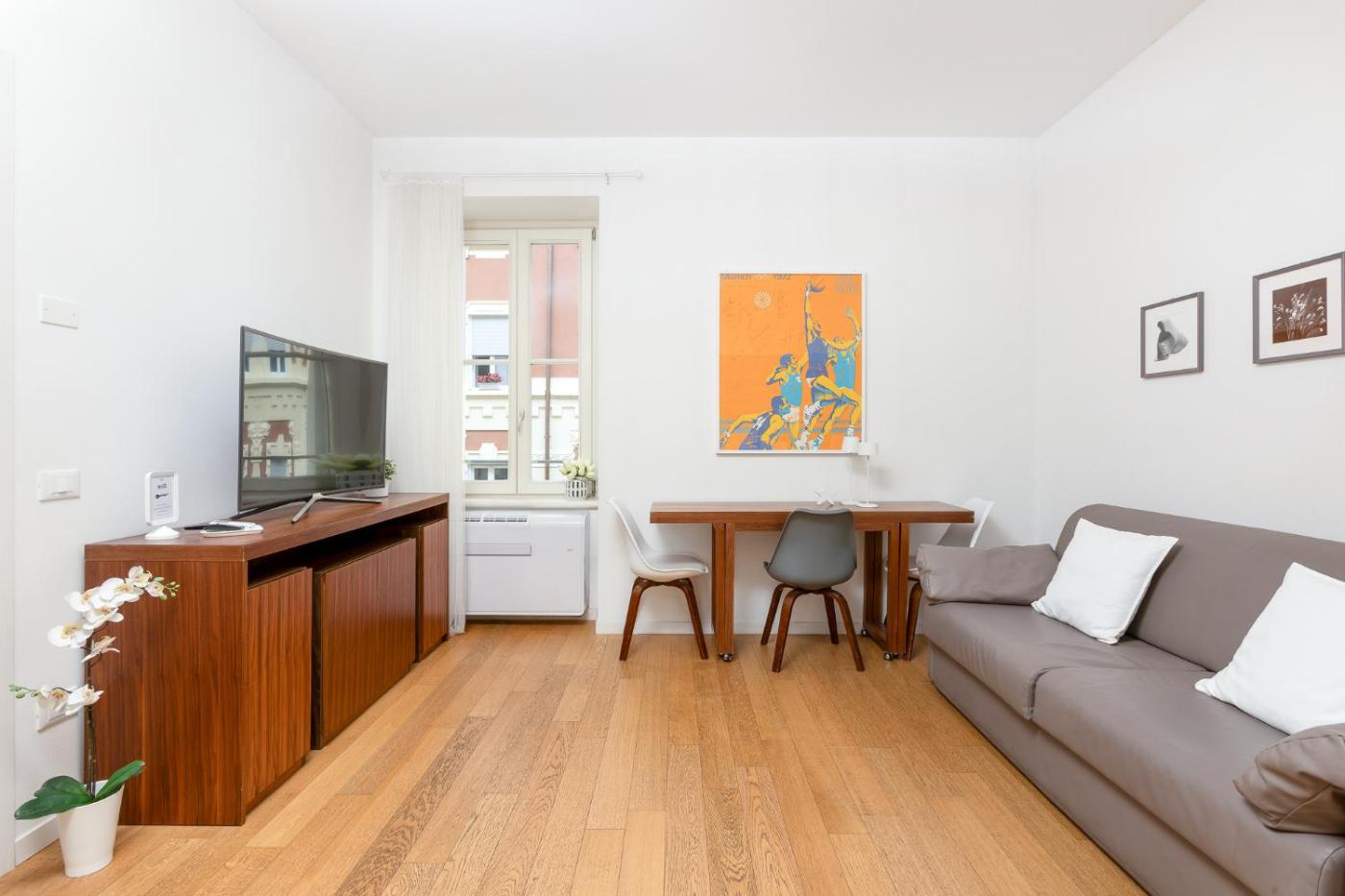 Appartamento con 2 Camere da Letto. This air-conditioned apartment includes 1 living room, 2 separate bedrooms and 1 bathroom with a shower. Guests can make meals in the kitchen that is fitted with a stovetop, a refrigerator, a dishwasher and kitchenware. The apartment has parquet floors, a seating area with a flat-screen TV, a washing machine, a tea and coffee maker as well as city views. The unit has 3 beds.